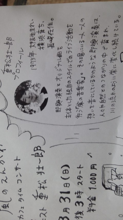 風のえんがわでは明後日、3月31日の午後3時より 重松壮一郎さんのピアノのコンサートがあります。 時や空気の中を流れるような即興演奏です。料金は千円です。当日参加も可能ですのでぜひ起こしください。