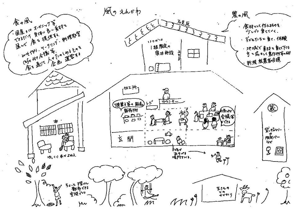 風のえんがわの庭にある、子供たちの遊び場の木・・・ここにツリーハウスを作ってみたらたのしいな・・・と、お店に来店した人にイラストを昨年お願いしました。 たくさん集まったイラスト・・・必ず1つの要素は織り込むようイメージしながら、ツリーハウスを作ることにしました。完成予定図はこのような2層構造・・・今回は、こちらの土台を作ることにしました。まずは、2本のうちの下側の木の土台から・・・どこからともなく現れた、プロの道具も使いながら・・・子供たちにも体験してもらいながら・・・大人たちの指導のもと・・・インパクトドライバーなどの工具を使い・・・水平をとりながら土台を組み立てていきます。ある材料を頭をひねりながら組み合わせて・・・ウッドデッキが完成しました。ここで、小さな完成を祝いながら・・・お昼は石窯でピザタイム♪ 腹ごしらえを終えると・・・少年のような大人達が木によじ登りながら、いよいよツリーハウスの床貼り作業開始!!木の上からの眺めはサイコー♪完成したデッキを見下ろしながら空中での作業をします。 下の子供たちから材料を上げてもらったり、柱をみんなで立てたり・・・ワイワイと楽しみながら組み立てていきます!! ロープやのぼり棒・・・いろんな登る手段を作るつもりですが、今回やってみたのが、クライミングホールド!!垂直に切り立った壁に、「無理かなぁ・・・」と思いながら、適当につけてみると・・・子供の能力ってすごい!!あっという間にみんな登り始め・・・楽しい遊び場に・・・夜まで、しっかり楽しみました。大人も子供も、夢中で取り組む「夢のツリーハウス」・・・次回は、下のツリーハウスの建物に取り掛かろうと思います!!
