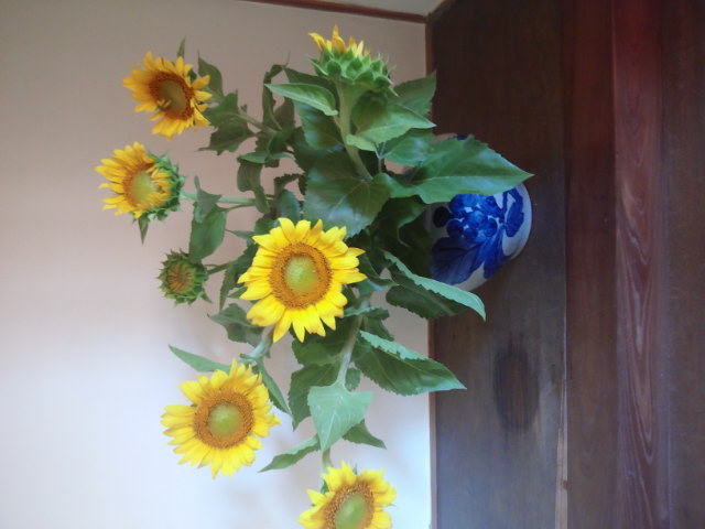 ひまわりがきれいに同じ方向を向いてさきはじめています。 初めてお店に生けられたひまわり。 なんだかゴッホのひまわりを思い出すような姿ですね。
