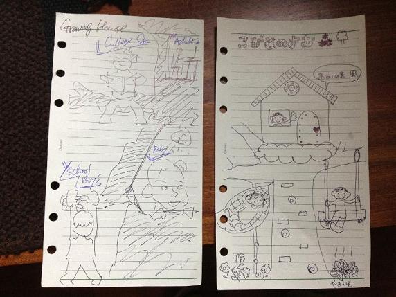 今日でオープン1週間・・・準備不足でいろいろと不便をおかけした点がありましたが、試行錯誤をしながら改善をしていきたいと思います。これからもよろしくお願いします。さて、Go-con2011の時に、この絵を配ったのをおぼえているでしょうか??一年前に絵を描いて、6割くらい完成したのでしょうか・・・・何事も絵を描いてみないとはじまらない・・・完成予想図があるからこそ、普通では無理なこともやり切れる気がします・・・実は、風のえんがわの子供たちに、ツリーハウスの建設を要求されています。明日から3連休・・・えんがわCafeにスケッチブックを持って行って、子供たちに絵を描かせてみようとおもいます。みなさんもケーキと珈琲を飲みながら、この木を見ながら絵を描いてみるなんていかがでしょうか?特に、子供たちには大人たちが見えないものも見えるはず・・・ちなみに、うちの娘に風のえんがわCafeの今後を描かせてみたら・・・・すでにカフェは8階建てになっていました(笑)どんな、ツリーハウスが描かれるのか・・・なるべくいろんな子供たちの夢を取り入れたツリーハウスを作りたいと思います。