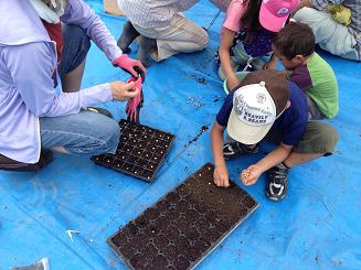 セイタカアワダチソウやギシギシだらけの空き地を、ひまわりの丘へ・・・大きな夢もまずは種をまかなきゃ始まらない・・・子供たちも、せっせと準備をしています。種用の袋も一つ一つ子供たちの手描きで・・・このプロジェクトに賛同していただいた、大人も子供も合わせて39名がこの種まきに参加いただきました。ありがとうございました。労働の後は、楽しい食事!!みんなでワイワイ作るピザを石窯に次々に放り込みます。新登場のソーセージ作りもなかなかうまくできました!! 石窯で焼くと・・・ビールが止まりません(笑)さらに、燻製しちゃうと・・・絶品です!!前日に隠岐からやってきた大鯛も、子供たちが拾ったワカメを混ぜた塩釜で焼くことにしました。大人5人がかりで、やっと持ち上がるビックサイズの料理も、美味しくてあっという間に骨だけに・・・ 大人が楽しく会食している間、子供たちは完成したばかりのツリーハウスでおおはしゃぎ!!ターザンロープに、左官屋ごっこ・・・夕日が沈むまで、遊んでました・・・・日が暮れるころには、県外から遊びに来た子も、小学生も保育園児も男の子も女の子も、みんな仲良く「か~ごめかごめ」(笑)見守る大人たちも思わず笑顔になるひと時です。次回は、ひまわりの芽が出たら・・・みんなで草刈りをしたいと思っています。もちろん、美味しい食事も、楽しい遊びも・・・・