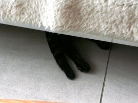 六甲山が時雨れています。。これで気温が下がると雪になるんでしょうね。明日の朝の出勤、大変そう。。この寒い中、明日の夜から飲み会が続きますーー。。おいしくいただくために体調管理しないと^^寒い日はウチのコたちは床暖にへばりつきます。ココは特等席。ベッドの下です。「ん?なんにゃ。。?」「せっかく寝てるのに。。」のびのび~「寝よ。。」ソファの下も爪とぎでボロボロになっていましたね。もー。。「あっかんべ」