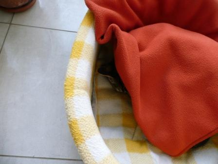 長かったお正月休みも今日を入れて2日。この年末年始は毎年、めちゃ主婦業で忙しく、ようやく昨日、ゆっくりできた状態で、仕事のことなど全く考えない日々。。そろそろリハビリせんと。。いきなり株価は超下落。昨年の秋ごろから感じていた景気の減速感がドドっと表面化しましたね。今年の中途採用の状況は、昨年よりもっと厳しくなるはず。。あ、ちょっぴり頭が戻ってきた。今日は元旦の日経新聞を読もう!。。でも、その前に。お昼はデパートでバーゲンに行く予定♪うーん。。完全復帰はやっぱり明日かなー^^;)【コロタはどこにゃ??】寝ております。。実はさっき、ブーンがコロタの寝ている上に乗ろうとしていました。。フリース、好きやから。。コロタが中にいることがわかって、ちょっと機嫌が悪くなり、ダンナさんにヨシヨシマッサージをねだってました。