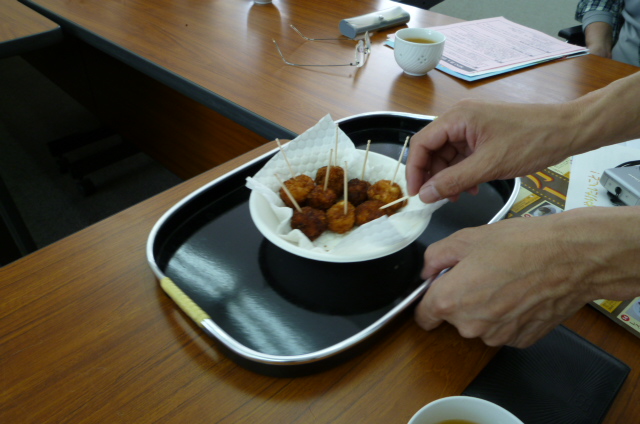 今回訪れたのは、近江八幡市。近江といえば近江牛、近江商人とか思い当たります。しか~し、本日はブラックバスコロッケ。ブラックバスと聞いて何を連想するでしょうスポーツフィッシングの対象魚とか、いろいろ有ると思います。しかし、ブラックバスは悪食で、大食漢なので生態系に影響を及ぼすことでもしられています。つまり、意外と厄介者なのです。その廃棄量も半端なく、ドラム缶サイズの廃棄箱に何十個と棄てられます。そんなブラックバスを有効的に食せないかと考案されたのが、ブラックバス入り「よそものコロッケ」なんです。ブラックバスは、タウリンやビタミンB2の含有率が高く栄養価も高いそうです。そして、琵琶湖にある沖島の周りは深度が深く、生息するブラックバスは良く運動しているので、身も締まって刺身で食べても美味しいそうです。こちらも産業廃棄物として捨てられるオカラ。こちらも栄養価が高い事で有名ですね。そんな魚とおからをクリームコロッケと合体。棄てられる物同士がコラボして出来たのが「よそものコロッケ」なんです有る意味エコなのかも事務局長 土田さんセンタースタッフの山本さんそして、近江八幡市には結構な数の観光客が訪れるそうで、そんな観光客達に片手で持って食べながら歩ける物をと考案されたのです。また、栄養価の高さから給食などで使って欲しいとセンタースタッフの方は言っておられました味の方なのですが、自分が食べた試食用のコロッケにはブラックバスが小さかったのかあまり感じ取れませんでした。が、一緒に行ったメンバーの中からは、あと味に泥臭さが残るといった意見も出ました。普段、海の魚を食べ慣れてる氷見の人間にしてみたらやはり川魚はどうしても泥臭さが目立ったのでしょう。今後、改良されるのが楽しみですざんねんながらまだ市内の料理店でしか販売されておらず、窓口としては非常に狭いのですが、きっとお土産屋さんとか、そのほかに取り扱ってもらえればきっと広まっていくと思います