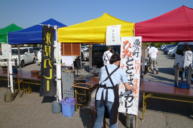本日、越中・飛騨ご当地グルメ秋の祭典in氷見が、氷見漁港にて行われました店長も、よしだや代表で参加してまいりましたよーみなさん、張り切って準備急げ~、始まるぞ~今回は、富山&岐阜&石川から48店舗が出店天気にも恵まれ、なかなかのイベント日和ですよーし他のブースも覗いて来ようっと先ずは、黒部ダムカレー昨年は、昼前に売り切れてしまい売り損じが出てましたよーお!二種類のカレーを持ってきてますねそうそう、この豚バラがインパクト大なんだよねぇ。一度見たら、忘れられんげ、肝心の商品撮り忘れってか、一口しか食べてません奥美濃カレーさんも、参加ありがとうございます。今年は、カレーヒッチャク棒を引っ提げての参加。割りばしの周りにご飯をきりたんぽ状に握ってあり、その周りに豚バラ。そして、カレーが塗ってあるというもの。この商品、前回のB-1グランプリにも出品したそうです。こちらも、早々に売り切れてました。氷見と言えば、ハットリクン今回のハットリクンは、ちょっと元気がなかったなぁその他、会場では色々なイベントが行われていました。とやまっ子まちなかアート!保育園の子供たちが、ダンスや太鼓などを披露してくれましたストラックアウトやスーパーボールすくい、駄菓子もあります綿菓子まであるしw連動して、100円笑店街と銘打って商店街でのイベントも行われ、こちらも賑わいを見せていました。大人も子供も楽しいイベントで、うちの子供たちも参加しましたが喜んでいました。このイベントは、今年で最後だそうで、来年以降も形を変えイベントやりたいなぁ