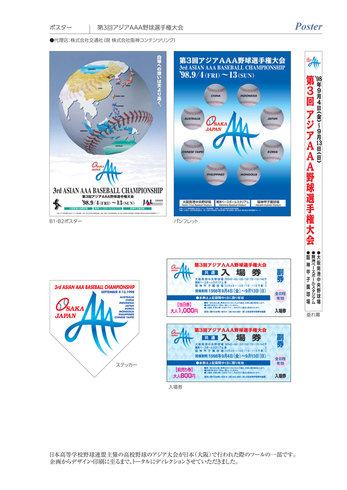 こんばんは。売上げ向上クリエイター黒岩陽一です。制作実績パート3です^^このツールはアジアの高校野球No.1を決める、国際大会でした。ちょうどあの松坂大輔がエースだった時なのでもう、かなり古いものとなります。ただ、国際大会のツールが自分にゆだねられているという感覚(もちろん、周りのブレーンの助けがあってこそですが)がなんとも不思議な感じで、やりがいのある思い入れの深いものなので・・・企画からJAPAN用のロゴ、ポスターにパンフ、チケット、ICカード等、何から手をつけていいのかを考えるのも楽しかったなあ。