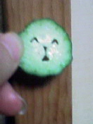 古い写真が出てきて、なつかしくなりました。 これ、、、何だと思います?答えは、輪切りにした、キュウリちゃんです。この目も鼻も口も、天然中の、天然!ある日、キュウリを輪切りにしたら、こんな顔をしていたのですよ。なんか和み系の笑顔も、また可愛くありませんか?人面キュウリ、なんて面白いカナ?