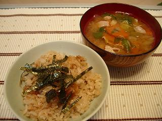 ダラダラお正月の最大の楽しみは、食べること・飲むこと???お正月のテレビ番組は面白くないとされていますが撮りだめしていた番組がいっぱいあるから、今年の寝正月には、見るものにも、こと欠かないもんねー☆けど、だらけすぎで、ジャンクフード(?)が多くて、いい加減、ヘルシーフードが恋しくなって...『ツナしょうがご飯』と、『とん汁』『ツナしょうがご飯』(4人分)米 3cupしょうが 2かけ(皮をむいてせん切り)ツナ(大) 1缶酒・しょうゆ 各大2.5(1)米は洗って30分ほど水に浸し、ざるにあげて水気を切る。(2)(1)の米を炊飯器に入れて少なめの水加減にし、ツナを缶汁ごといれ、しょうが、酒、しょうゆを加えて炊く。*** 炊き上がりに、刻んだ万能ねぎ、のりなどを散らしてもGood!!『とん汁』沸騰しただし汁に、ねぎ(斜め切り)、にんじん(いちょう切り)、豚肉(こま切れ・一口大)を入れ、少々煮込み味噌をとくだけ☆・・・よく、細木数子さんの番組で、お料理を紹介していて、味見する細木さん→「やだっ わたしって、お料理ホントに上手ねーーー」と自画自賛してますがその気持ち、よく分かりますよ(笑)味見した瞬間、「うまっ!!!!!わたしって、いい嫁になれるじゃーーーん!!」と、独り言。今日のこの組み合わせなんて、酒に酔った旦那さんが、最後の〆にするには絶品のお料理ですわよ