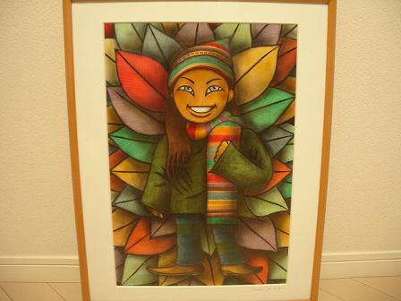 いまから、9年も前に遡ってしまう、お話です…。わたしがまだ20代で、何もかもを怖いもの知らず? で、いた頃です。当時、8歳年上で、仲良くさせていただいた方がいて、姉のいないわたしには、お姉さんのような感じでもあり、彼女のお宅によく遊びに行っていました。彼女は、ご自分のビジネスに成功された方で、お一人で、都内の、家賃が○十万円もするマンションに住んでおり、ちょっとしたセレブな感じでした。そのお宅には、ビジネス関係の方など、いろんな業種の方たちがよく訪れていました。ある日いつものように遊びに行くと。「月子ちゃん!!見て見て!!!」と、興奮気味に紹介されたのが、この絵です。え・・・・なに。この絵。まるで、わたし・・・・???そう、この絵は、わたしの似顔絵?とでもいえるように、わたしにそっくりなのです。そのお姉さんの家にその日、訪れた方たちのなかで画家の方がいて、その方の作品なんだそうです。その画家の方もその場にいらっしゃったので、「どうして、この絵を描かれたのですか?」と、不躾にも、その場で聞いてみました。だって、彼とわたしは、その日が初対面.....!!彼がわたしをイメージして描いた絵でないことは、明白です。彼としても、戸惑いがあったのでしょうか、なかったのでしょうか?わたしの驚愕とは裏腹に、「・・・雑誌なんかを見ていて、インスピレーションで、描きました」という、なんということもない平凡な(?)お答えでした。ここまで読んだ皆さんのなかでは、「はは~ん。さては、この画家と、うずまき月子は、そのあと恋愛関係におちたのか?」なんて思う方もいるでしょうか?(笑)残念ながら、まったくそんなことはなく、けれども、わたしは、この絵から離れがたい気持ちが沸き起こり、(自分に似ていることもさながら、この絵が放つ元気のよさ・明るさに惹かれて)その場で、価格交渉をし、確か3万円くらいで、この絵を購入したのでした。人生で、最初に購入した、絵なのです。そして、それ以来、その画家の方とは、一度もお会いしていません。その後、わたしの友達がわたしの家を訪れるたびに、「なにこれ~。月子の自画像???」と、驚かれました。しかし、年月がたつにつれ、最近わたしの家を訪れる人たちは、この絵を見ても、わたしの自画像、と認識してくれなくなりました。もう、こんなに、色も黒くないし・・・(当時、波乗りばかり行ってて、色が年中黒かった)わたしも、この絵の自分から、そろそろ卒業しつつあるのかな??・・・にしても、なんだか不思議なご縁のある絵だよね。と、折にふれ、いまだに見つめてしまう、絵なのです。