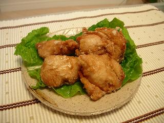 最近、なぜか『鶏』の味が恋しいのです~某コンビニ a○p○の、鶏照り焼きサンドウィッチがものすごくお気に入りでしょっちゅう食べていたのですが、いつのまにか、姿を消していました....。なんで?! ああいう美味しいものは、定番にしてほしいよぉ。それからおいしい鶏料理を色々と探しているのですが、そうそうしょっちゅう外食もしないし...と思っていたけど、忘れてた!!!わたしって、鶏の唐揚げの、名人なのですよ☆(もっと早く気づけ~、って???)それで、ひさしぶりに、つくってみることにしました。ホントにカンタンなんです。鶏もも肉を一口大に切って、しょうゆと、すりおろしたショウガで、しばらく漬け込みます。それから、鶏肉に片栗粉を、ギュッギュッとまぶし(片栗粉をつけて鶏肉を手で固く握るくらいで、ちょうどいい感じ)揚げるだけ!!わたしが愛用している「無水無油」鍋だと、油を1cmくらい引くだけ、それから鶏肉を鍋に放り込み、ふたをしてしまいます。途中、一度、ふたを開けて、鶏肉をひっくり返しますが、ものの数分後には、外はカラっと・中はジューシーな、さくさく唐揚げの出来あがり~揚げたてが、サイコーです