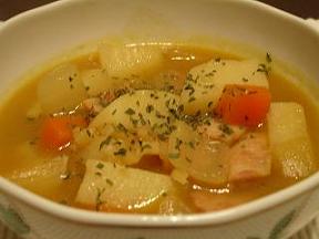 最近、はまってしまっているのがこれ!『スープカレー』札幌が発祥の地らしく、大泉洋がよくテレビで語っているのを見たことがあります。実際、北海道に行くと、大泉洋プロデュースのスープカレーが売っていました。グルメな先輩や友達も、スープカレーって、おいしいよ~というしよーし、スープカレーデビューは、あの(どこの?)名店で!!…と密かに決めていたのに、ふと開いたお料理本に、ごく普通に、このスープカレーのレシピが、存在していたのです。「これは、作ってみなさい~ってことなのかしら?」ということで・・・材料:(たぶん2人前αだと思います)スモークポーク(ソーセージでもOK!) 3~4枚→1cm幅くらいに切る玉ねぎ 1/5個 →1cm角に切るにんじん 1/4本 →1cm角の厚さ5mmじゃがいも 小1個 →厚さ1cmのいちょう切りパセリみじん切り →適宜カレー粉 →小1固形スープのもと →1個*オリーブ油、しお、こしょう(1) 鍋にオリーブ油を熱し、玉ねぎ、にんじんを中火で炒める。 野菜がしんなりしたらカレー粉を加え、香りが出るまで炒める。(2) 水2カップを注ぎいれ、煮立ったらアクをとり、5分くらい中火で煮込む。(3) じゃがいも、スモークポークを加える。再び煮立ったらアクをとり、 固形スープのもとをくわえてフタをして5分ほど煮る。 しお、こしょうで味を調える(結構、味がでているから、わたしは、 しおは入れませんでした)。 器に盛り、パセリを散らす。ご飯にかけてもいいし、パンにも合います サラサラしてるのに、ほどよく味にパンチがあるの!とってもカンタンだし、ぜひ試してみてください