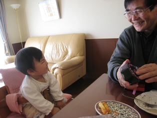 ジジのご馳走で まいまいたちと お寿司を食べに行くことになりまず まいまいたちの家に向かいました白い可愛いワンピ これって大人の服よりも高そうじゃないか?おもちゃで機嫌よく遊んでいたと思ったら ジジのデジカメを離してくれないそして ジジの少ない髪の毛に 興味深深… (笑)みんなでテーブルについてお茶をしていたら部屋の隅に置いておいたはずの まいまいが いつの間にハイハイでおばちゃんの足元に 移動してきた … つぶらな瞳で じっと見られちゃったさて お出かけですこんどはバーバリーのマントなんか着込んじゃって~フードをかぶせた顔が可愛くて 写真撮っちゃったまいまいは フードは嫌いみたいなんだけど…うずまきパパがお気に入りの「金沢まいもん寿司」ですまいまいと来るのは 初めてなんか 寿司待ち顔じゃない??ジジの膝に移動冬ってお魚が美味しい季節ですね寒ぶり・金目鯛・白エビ・いさきサーモン・一本アナゴ・エンガワ・スズキ?・あとお塩でいただいた美味しい白身魚・・・(くやしい~名前忘れました)「まいもん寿司」はネタも新鮮だし手軽でおいしくて 大好きですでも まいまいは 実はまだお寿司は食べられないのでママが持参してきてくれた 離乳食です(お店で食べてもOKだそうです)食べ終わったら眠くなっちゃったので ジジの腕のゆりかごへ…ジジは本当に寝かしつけ上手で・・・まいまいは ストンと夢の国へ鼻の穴全開だよーお腹いっぱい 楽しくて暖かいひとときを みんなで過ごしました