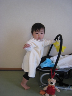 1ヵ月半ほど まいまいよりもおねえちゃんのお友達と遊んでいたら…なぜかまいまいは 対抗意識を燃やしてお友達がハイハイすると追っかけたりそのコの後ろ手に回って 髪を引っ張ったりお友達を 威嚇していたそうですイジワルな まいまいなんだか だんだん人間らしくなってきてるのかなぁ?立ち姿 見事でしょ