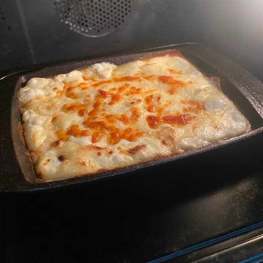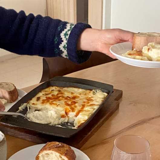 じゃがいもを牛乳とにんにくで煮てから焼きます。