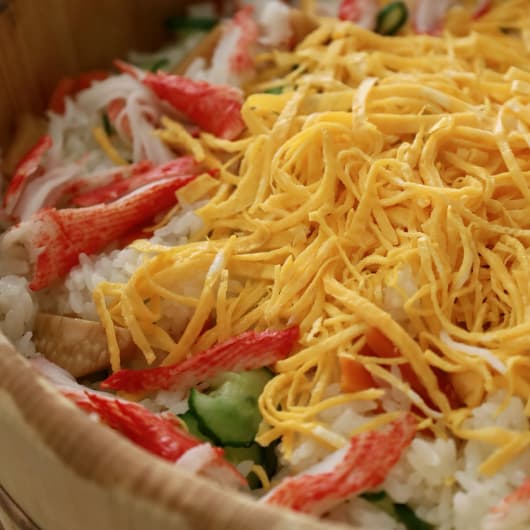 ③ごはんが炊けたらすし酢を加え混ぜる。