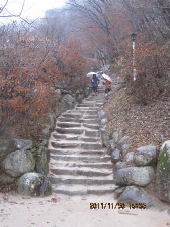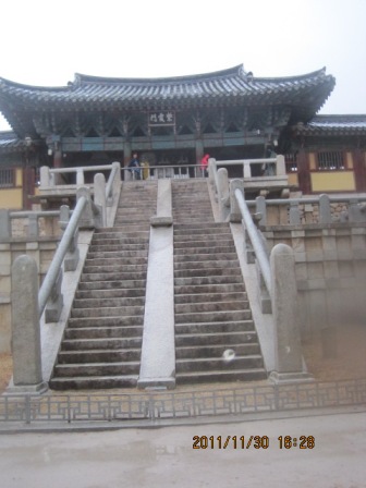 >仏国寺 白雲橋、青雲橋は、階段を「橋」という。この壁の向こうが極楽で、こちらが現世である。上が青雲橋で、下が白雲橋。参詣者が、白雲橋をわたれば苦しみに満ちた現世を安らかな仏の世界に入ることができると言われる。然し、いまは立ち入りが禁止されている。二つの橋は全部で33段あり、仏門ではひとは33段までしか登ることができない。悟りはひとには厳しい越えられない海断えもあるのだ。だから他力本願でもある。仏の力なしには救われないという教えでもある。 極楽ヘ架かる白雲橋、青雲橋 17段と、16段ある。上が紫霞門、その先に本殿の大雄殿がある。 >仏国寺の世界観は興味深い。地上に造られた極楽の世界がある。