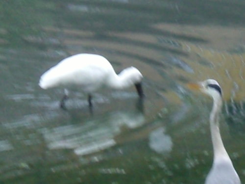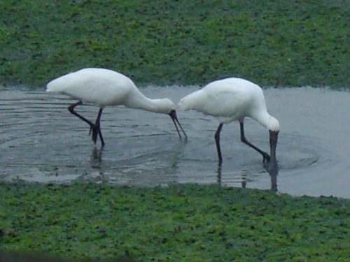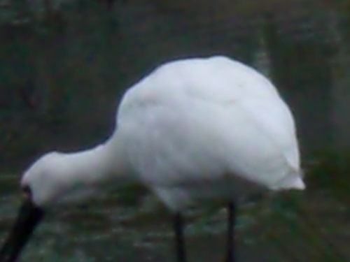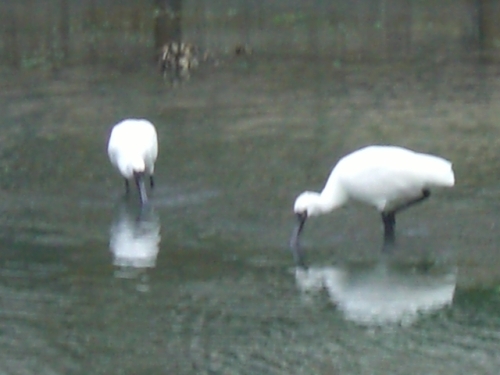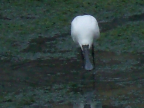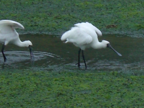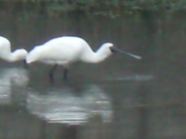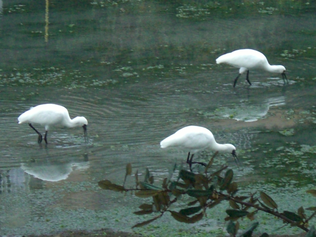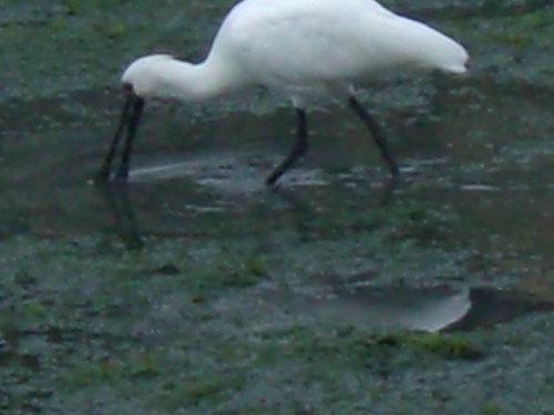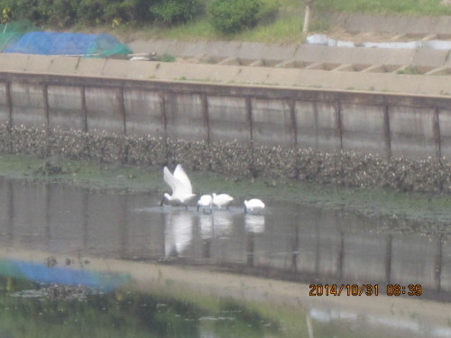 2014.10.27に15羽。 10.31 は8羽のクロツラヘラサギを見たのだから、運がいいと言えそうだ。しかも2羽は、かなり離れた場所にいたが、6羽は、貯水池のわき道から撮影できたから、普通のデジカメでしかないが、樹木を通してだが、エサ取りに夢中になっているクロツラを撮影できる絶好の場所であったが、何しろ、クロツラがヘラを左右に激しく動かすスピードが速いので全くついていけなかった。 ・どうやら人が見ているのは気付いているようだ。それでもあまり警戒する様子が見えない。餌を丸呑みしており結構獰猛な顔をしている。昨年の11月に探鳥の会に参加して、それから関心を持って干潟の観察をしているが、珍しい水鳥たちが多いので、写真を撮るのが楽しみであり、趣味が一つ増えた。そして、行けば必ずいるとは限らない渡り鳥たちが、潮の加減をよく知っていて、同じ場所に来ているようだ。 ・へ2・・・今朝は、それこそ一年の内でも運のよかった日なのだろう。人も少なかったし、至福の時間を過ごすことができた。顔を撮ろうとしたが、失敗ばかりした。どうも撮影の基礎ができていないからだろう。カメラマンではないので、まあ、仕方がない。下手なりに撮影を楽しんでいればいいと思う。