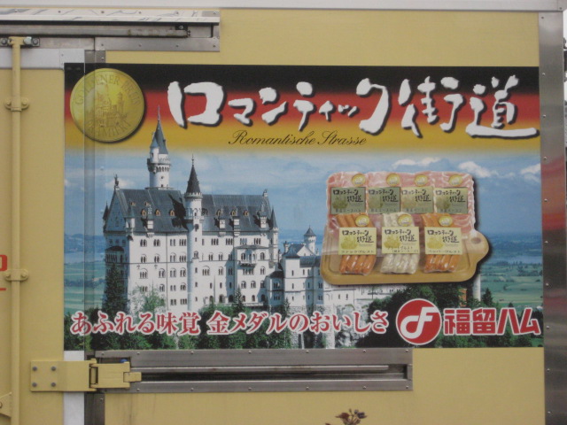 散歩していたら、「ロマンチック街道」に出会った。マーケットの駐車場に停まっていた保冷車の看板である。「ロマンチック街道」はドイツではローマ人が通った道路のことだと聴いた。古城がいくつも残っている。それをドイツ人は大事にしている。其れを観光地にしているのだ。まさか、ハム会社の保冷車の看板になっているとは。
