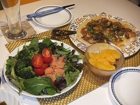 スモークサーモンのサラダ・餅ピザ・いよかん・・
