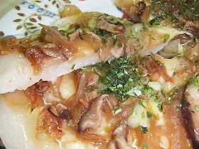 切り餅6個を小さく切ってフライパンで両面焼き~チーズをのっけて、炒めておいた具をのせただけ