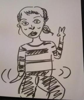 タイトルに釣られた方!多いんじゃないでしょうか。(*′皿`艸) 引っかかった~♪実は、ブログをいろいろと拝見させて頂いておりましたらご自分で絵を書いておられる方がいらしたりしてあまりのうまさに衝撃を受けました。いえ私も小学4年生の頃はアニメーションクラブに所属し意外と絵には自信があるんですよ!私も絵が書けるんだぞ!というところを今日は皆さんにお見せしたかったので自画像を描いてみました。昔は「中山美穂に似てる」とよく言われた私です。↓↓↓コアリズムを踊っている私です。Vサインなどして余裕すら感じられます。そして、よくウエスト画像を載せていますのでお気づきの方もいらっしゃると思いますがボーダー柄を着ている確率が高いです。いや、ほぼボーダーです。街でボーダー柄を着ている方を見たら私と思って頂いても良いくらいです。(そんな・・)それとズボンに注目です。コアリズムを踊っていると99%の確立でチャックが降りてきます。街でチャックが降りた女性を見かけたら私だと思って頂いてほぼ間違いないと思います。じゃぁにぃ~