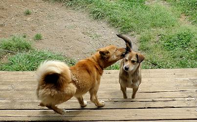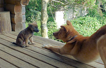 捨てられた子犬を預かって飼っている我が家の番犬はすっかり板についてきた。適当な小屋が無いので、ログハウスのベランダが居場所となっている。ログハウス脇の道が拡幅されてからとても見晴らしがよくなり、ベランダからは道路を通る人々がすぐ目の前に感じられる。そこで、まるで道路の番人よろしく、全ての通行人をベランダから見下ろしている。いつもは誰か来ないかなぁという顔でぼんやりと眺めていて、来たら勢いよく吠える。犬を連れた散歩の人や、電線を渡るリスなどを見える限り吠え続ける。通行人にとってはとても迷惑な番犬である。