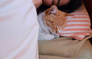 すっかり我が家に居着いたノラは、いつも亡き妻の枕で寝る。何故か不思議と、隣にある私の枕を使ったことがない。妻の枕に、人間の様に頭をのせて心地よさそうに寝ている。毎夜遅くお酒を飲みながらテレビをつけると、隣のベットで、いつも同じ姿勢で寝るのである。