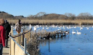 元旦は何故か毎年穏やかな好天に恵まれている。今年も絵に描いた様な正月らしい、素晴らしい天候となった。そこで鶏の世話を終えると、里帰りしている子供達と散歩に行くことにした。犬を連れて、200mほど離れた沼まで出かけた。寒く静かな湖面には沢山の白鳥がいる。いつも多い見物人も今朝は少なく、久々にのびのびと見ることができる。ここの見物人の少なさも元旦らしさを感じることである。