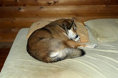 捨て犬を貰い受けてから3年半になる。毎日見ていると気付かないのだがずいぶんと年月が経ったものだ。ログハウスのベランダが住いで、すぐ脇の道を通る方を吠えて迷惑がられている。それでも犬なので、宅急便の方や偶に来る方でも来客には吠えない。毎日一度、近くの土手を散歩するのが唯一の楽しみなので、その話をしただけでもそわそわする。それ以外の時は殆どがご覧のような格好で寝ている有様である。しかし、動物は愛おしいものである。