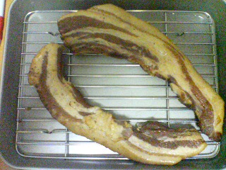 昨夜遅くに燻煙が終了しましたあともう少しで完成です75度のお湯で2時間湯せんにかけますその間温度計とにらめっこちょうどお酒の燗の温度を計るおかんメーターなるものがあったので使用しました決して母親を測るものではありません2時間後湯せん終了でそのまま30分間氷水で急速冷却です冷却が完了して約2週間の工程を経た自家製ロースハムが完成しました感激感激切るのが楽しみです