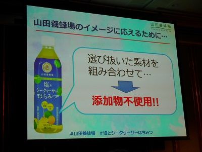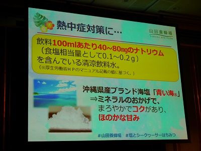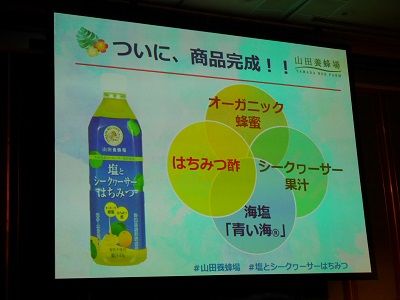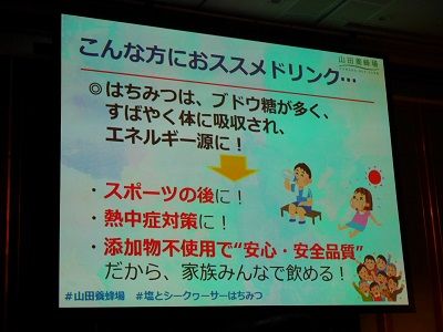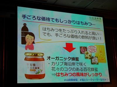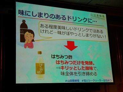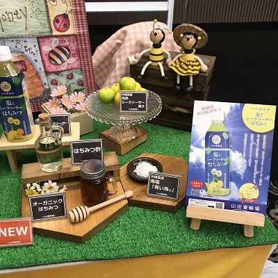 当日のブースの様子です。試飲は、勿論のこと、はちみつ、はちみつ酢、海塩の食べ比べができました。