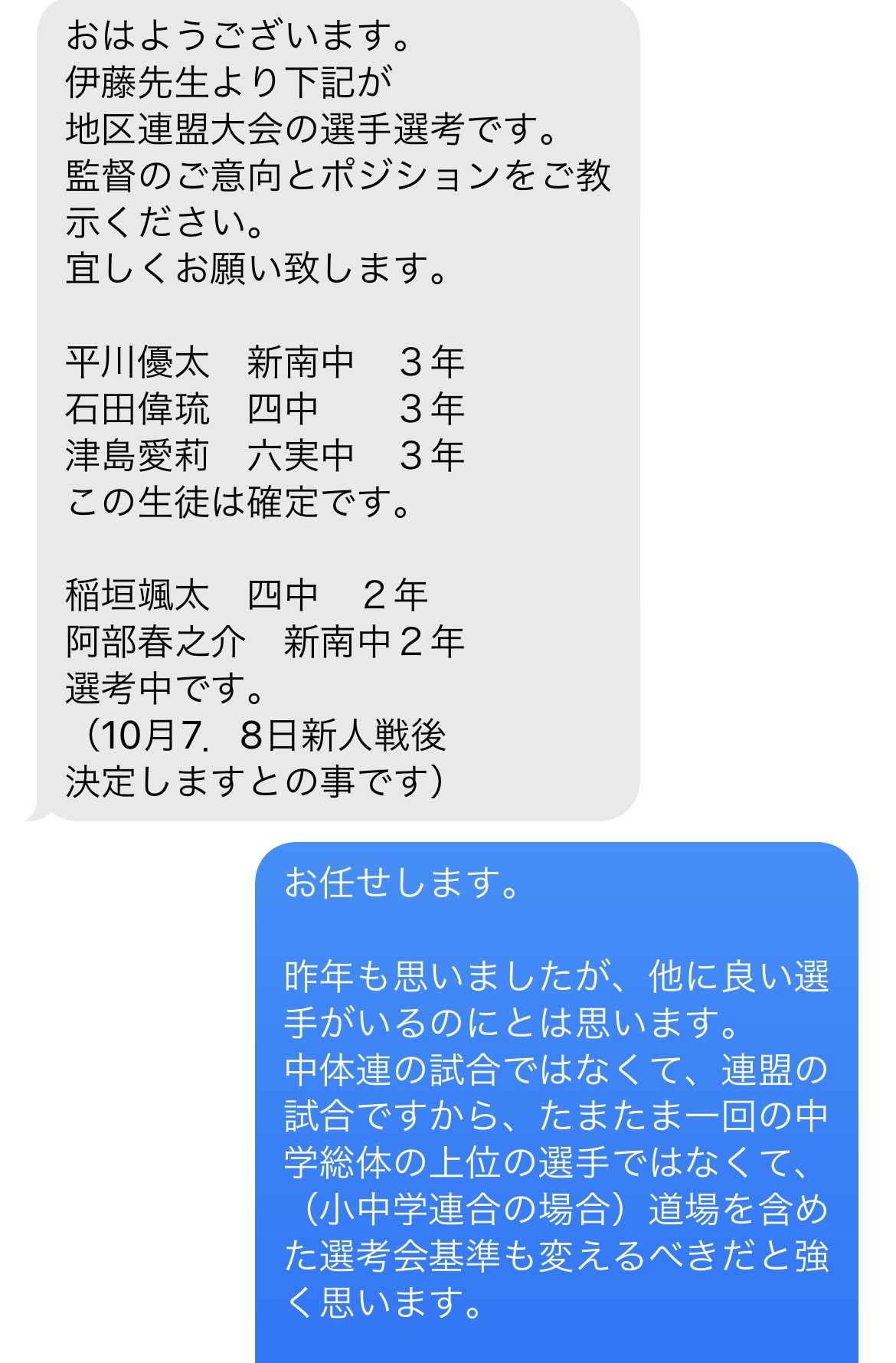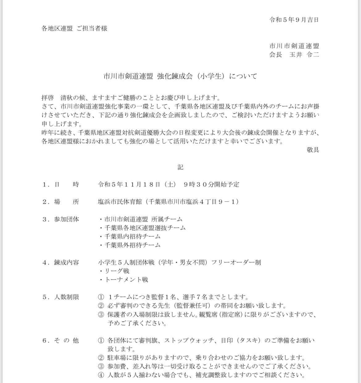 今、コロナ、A型インフルエンザ、アデノウィルス感染と流行ってますから、熱発する人多いみたいです。哲平と鼓太郎は、新千葉体育館(綺麗ですねー)の県民大会に出場、3回戦で浦安市に敗退したようです。 私は久々に松風館道場、その後剣幸会道場と2部練でした。無理せず軽めの稽古で、自分の調整しはじめてます。11月の日本武道館、自身の審査申込をしました^ ^ 桶川大会べに花杯は、〆切の関係で仮メンバーですが申込を済ませてます。千葉県中学新人の個人戦が重複してますので、阿部春、金原、北島、余野に重複の可能性があります。前3人のうち出れない人が出たポジションにメンバーを入れ替えます。三年生の成菜と亜衣も出る前提お願いします。また、菊まつり大会(勝ち抜き戦)も小学生と中学生(男女混合)の2部門にエントリーしましたが、新人戦女子団体戦が重複してます。大会当日のみ参加して前日の錬成会は行きません。メンバーは、余野、阿部春、北島、柴田、平川の布陣の予定ですが、、四中が県大会新人戦に出場の場合は、余野→成菜ちゃんで行きます。宜しくお願いします。