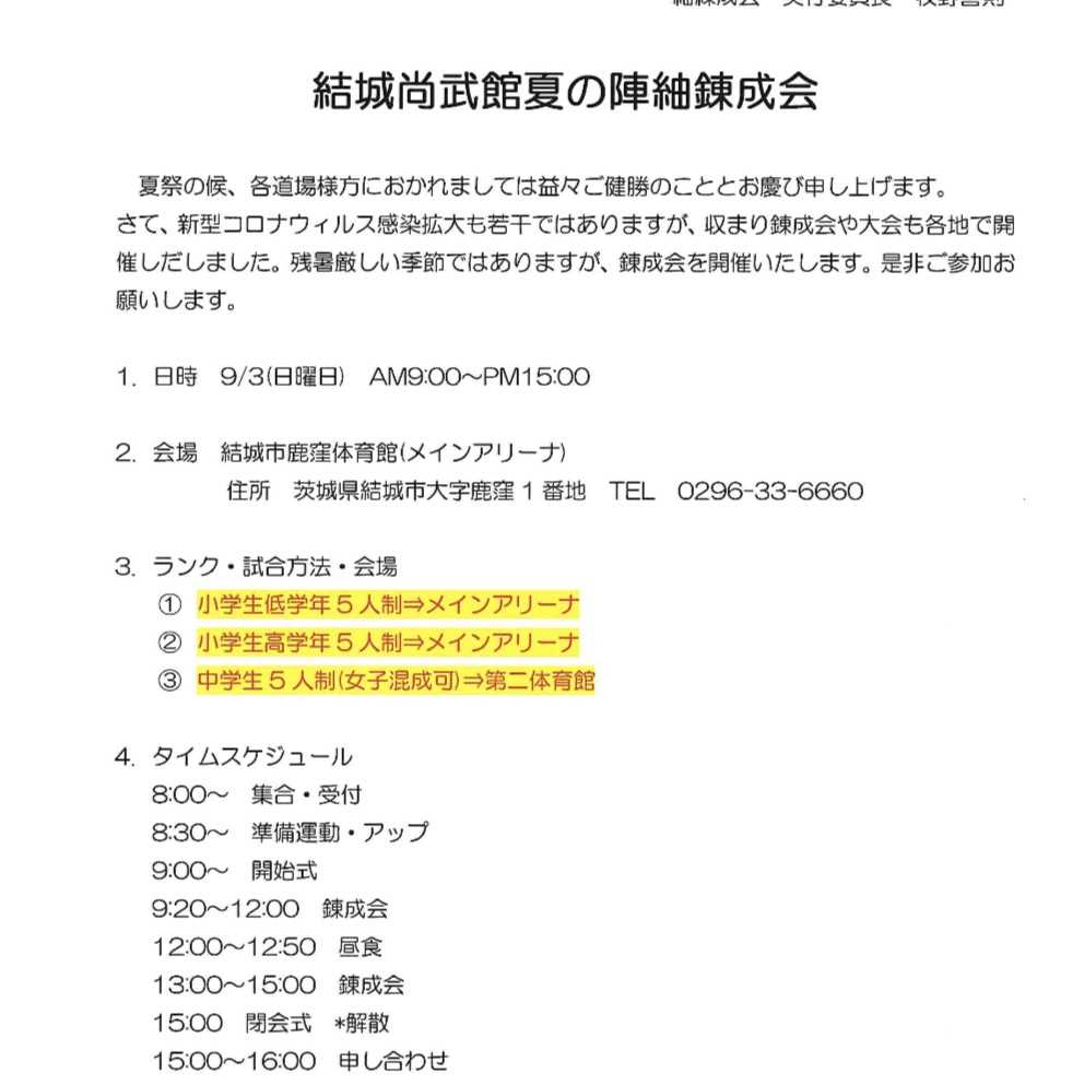 中学生、小学生、低学年3部門参加させていただきました。剣幸会の一期生から交流させていただいてます(今30歳の洋介が5年生でした)。一期生達が総和さんに招待されまして、桶川さん、蔵志会さん、尚武館さんの5団体での錬成会に参加させてもらえたのが、県外関東地区への錬成会初参加でした(0-5でいっぱい負けました)その年から結城市にも毎年来てます。今回は、初めて松戸市剣道連盟の団体名で登録させて頂きました。中学生の部は全中出場した近県代表選手が、当日は所属道場から沢山参加。非常に見応えがありましたし、審判する中学生達もハイレベルな試合を上手にジャッジしていたように思います。中学生の部は千葉県総体に出場した剣幸会単独7名で参加(1名欠席)しました。小学生高学年は、強化(指定)選手の剣幸会の5人に、6年生内村さん、4年生荒井くんと高橋くんで参加。殆ど僅差の試合内容でしたので、健闘してたんじゃないかなと思います。低学年は、強化(候補)選手の剣幸会と東警察の2年生5人でチームを組ませて頂きました。完敗したり、たまに全勝もしたり、近県の選手達といっぱい勉強させて頂きました。10月の強化錬成会はそろそろ予定の18チームになりそうです。10月は3年生も強化部に入れたチーム編成の予定です。高学年チーム 低学年チームと高学年チーム 中学生 小学生の参加団体 帰りは、悠以と成菜で、ちょっと後会しました^ ^
