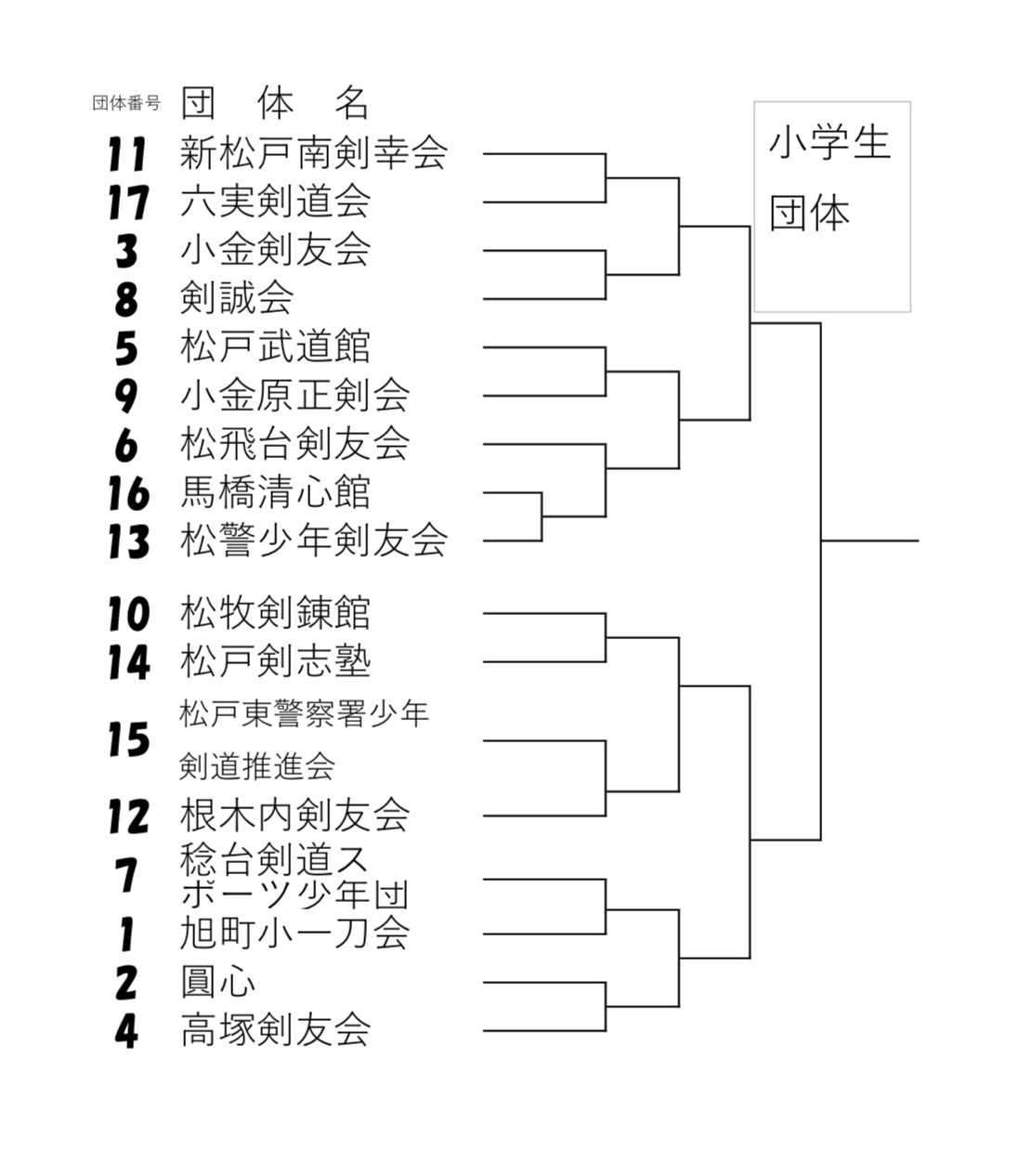 10/12修正しました(結城遠征追記)市川市剣道連盟強化錬成会は剣幸会としても出場しますので、松戸市剣道連盟代表チームと両方出場します。出場予定の選手は調整中のため、追加変更もあります。 松戸市剣道連盟小学生強化担当責任者 福島孝幸★10/1(日)雄武南錬成会高学年の部 剣幸会単独チーム 愛真⑤、諒真⑤、大河⑤、大地⑥、励⑥低学年の部(U3年) 松戸市剣道連盟チーム 加藤潤②、加藤湊②、菅原清矢②、増田晴人②、瀧澤煌真②★10/8(日)道場休み 日本大学松戸歯学部剣道部創立50周年式典 孝幸(元監督)、祐輔、洋介(現監督)、桂(現コーチ)、出席★10/14(土)松戸市民大会小学生団体戦(個人戦も出場) 潤、湊、大河、大地、励中学生男子団体戦(個人戦なし) 優太、亜衣、浩世、成菜、悠以個人戦のみ 諒真、愛真、陽太、ケニー、輝莉一般個人戦 羽田、梶、田代(幸)、廣瀨一般団体戦 小山(哲)、福島(祐)、垂井(恒)、平川(巧)、阿部(鼓)★10/15(日)全国道場剣道選手権大会、道場対抗 中学生男子の部(千葉県から代表選手2名出場) 優太★10/15日(日)第50回巌心旗総和大会小学生団体戦 愛真、諒真、大河、大地、励 中学生男子団体戦 悠希、春之介、瑞歩、成菜、悠以 一般団体戦 垂井、平川(巧)、○◯(館長は同日開催の優太出場大会に引率)★10/21(土)花野井錬成会 高学年の部(3人制) 大河、大地、励 ★10/22(日)松戸市剣道連盟強化錬成会高学年の部(4年生以上) 松戸市チームA(女子チーム) 大西④、上田⑤、青木⑤、小林⑥、内村⑥ 松戸市チームB(男子チーム) 高橋④、荒井④、染谷④、手代木⑤、伊東⑥、工藤⑥ 松戸市チームC(剣幸会チーム) 愛真⑤、諒真⑤、大河⑤、大地⑥、励⑥低学年の部(原則U3年生) 松戸市チーム 深野③、佐藤③、潤②、湊②、菅原②、増田②、瀧澤②、 、 、 、(2チーム) ※あと3名は、市民大会で候補選手を決める予定★10/29(日)地区連盟対抗優勝大会 松戸市代表チーム 工藤⑥、内村⑥、吉井⑥、 プラス中学生 優太、他3名★11/5(日)道場休み 館長私用のため★11/12(日)神栖菊祭り大会 勝ち抜き戦 小学生団体戦 愛真、諒真、大河、大地、励 中学生男子団体戦 優太、悠以、春之介、悠希、愛(決定) ※ 前日の錬成会は不参加の予定★11/18(土)市川市剣道連盟強化錬成会 小学生団体戦 松戸市代表チーム(7名参加予定) 荒井④、手代木⑤、小林⑥、工藤⑥ 、國井⑥、他2名予定(調整中、市民大会後に補填します) 剣幸会チーム 愛真⑤、諒真⑤、大河⑤、大地⑥、励⑥★11/19(日)桶川べに花杯 小学生団体戦 愛真、諒真、大河、大地、励 中学生男子団体戦(5人制) 優太、悠以、瑞歩、成菜、亜衣(決定) 審判免除★11/23(木)結城遠征 秋・冬の陣紬錬成会(調整中、申込済) 中学 剣幸会単独 優太、悠希、春之介、瑞歩、愛、他( ) 小学 剣幸会単独 励、大地、大河、愛真、諒真 小学 松戸市強化チーム(6〜7人予定) 低学 松戸市強化チーム 加藤潤②、加藤湊②、菅原清矢②、増田晴人②、瀧澤煌真②★11/26(日)未定★12/3(日)道場休み 岡村先生来館、剣幸道場特別稽古会の予定★12/10(日)雄武南馬場杯 個人戦 加藤湊、加藤潤 団体戦2チーム 優太、悠希、悠以、愛、励、大地、大河、諒真、加藤潤・湊(館長私用のため欠席)審判後日決定 ★12/10(日)片山剣友会記念大会団体戦 松戸市剣道連盟チーム 監督高島 青木⑤、外川愛⑤、荒井④、手代木⑤、國井⑥女子団体戦はエントリーしません(館長私用のため欠席)★12/17(日)蔵の街剣志会創立35周年記念大会 小学生団体戦 愛真、諒真、大河、大地、励 中学生男子団体戦 優太、悠希、春之介、瑞歩、愛 (予定) ※ 前日の錬成会は不参加の予定ですが、希望なら中学生を申込します。★12/24(日)上の台剣友会創立記念大会 中学生男女混合団体戦にエントリー予定 優太、悠希、春之介、悠以、愛 の予定 (館長私用のため欠席) 小学生低高混合団体戦はたぶん不参加 ※ 群光旗は中止になりました年内は以上です