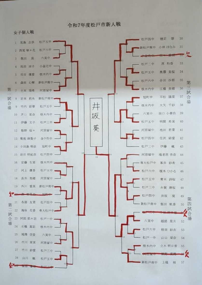 一年生で究極の早生まれのため、この子が小6だったら、と春先の試合を見てて何度も思いましたけどね。力強さも伴ってきて、そろそろ行けるかな?って思ってたけど、惜しくも準優勝でした この1〜2学年の女子の小学生時代2年生は内村さんが松戸市強化指定選手で代表入りしてましたが、中学は都内私立に進学してますし、もう一人の強化指定選手の小林選手は欠場。1年生は5人と過去最多の強化指定選手がいて、上田さん、青木さん、外川の三人が小学生時代の代表選手。他にも穂苅さん、各務さんが市内個人の優勝経験者です。抜群のセンスを持ってた上田さんは音楽を選択。外川と穂苅さんは伸び盛りって感じです。青木さんも機会の捉え方がとても上手く、各務さんは勢いがあります。優勝は2年生の井坂さん、松牧の阿部先生とこに居た子かな。県大会頑張ってください。新南男子は稽古不足が否めず、個人団体共に3位に甘んじてしまい、久々に男子県大会出場者無しとなりました。負けた日に稽古に来たのは、吉井、垂井の2人。可能性は2人にはあるかもだけど、ちょっと遅いよねぇー普段は、基本稽古しないで、地稽古数回だけして、早めに上がります。一生懸命稽古してるのはいつも四中女子達で、これって新南中やばいですよねーって話題にはなってました。差はね、団体としては、リーダーが不在なんだと思いますよ。個々は仲良し会だしね。今回、審判受けなかった理由一生懸命やらない子達に、仕事休んでまで行く気になれませんでした🤔まっ、今回に関しては、想定通りってことですねー愛真以外は初心者の女子新南中が第3位に入賞㊗️一年生が沢山入部!団体戦も組めて良かったですね^_^夏は県大会出場を目指して頑張ってください🤗