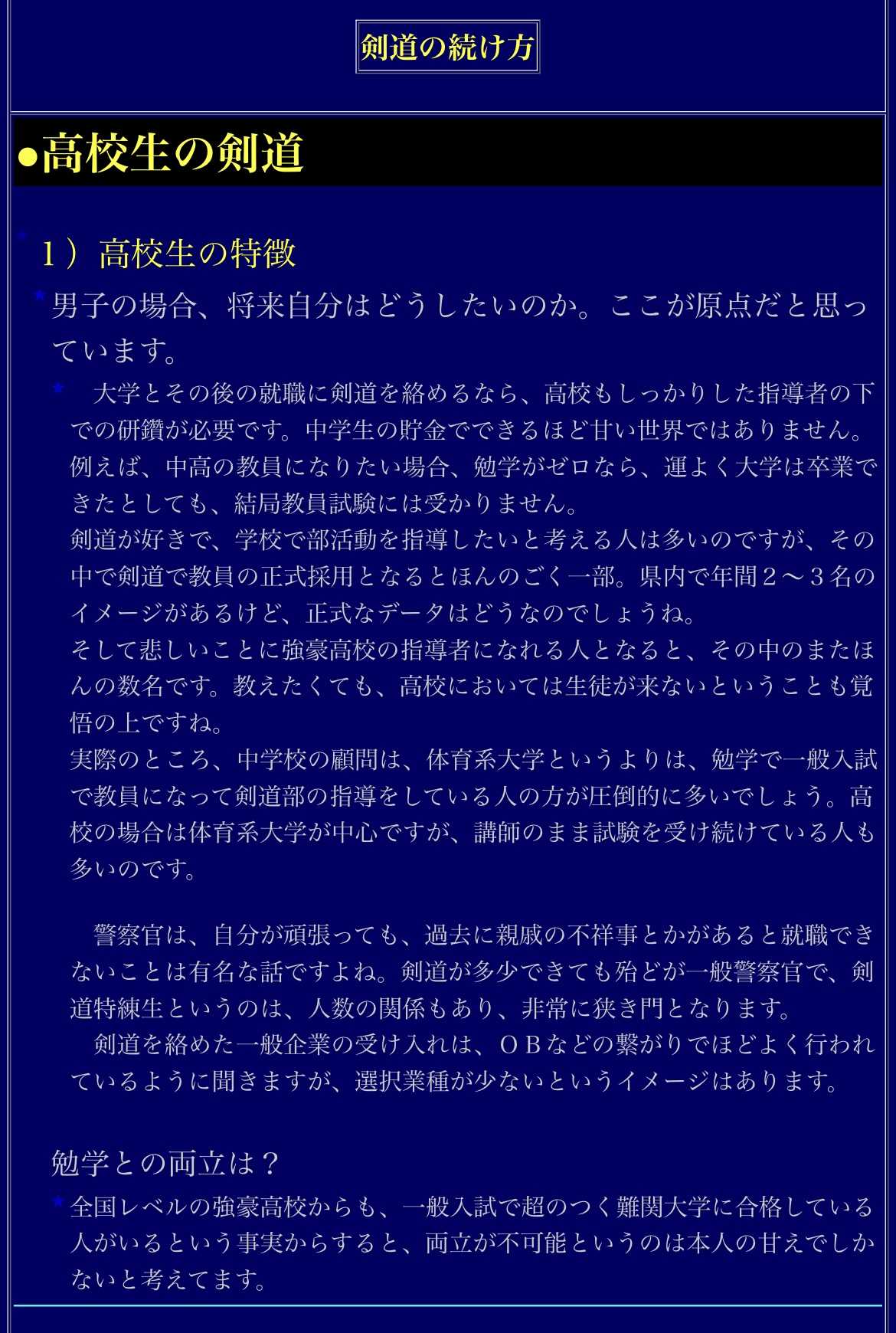 根底にある私の考え方は、昔と何ら変わっていませんホームページトップの募集の下に剣道の始め方続け方https://www5f.biglobe.ne.jp/~kenkokai/sub6.htm何回か紹介してますが、高校の選び方も書いてます20年位前に書いたけど、全く追記も修正もしてないんですよ🫡我が家は、自分の子供の高校進路は失敗したね。と、神さんには言われます。明らかに経験不足でしたね😢それゆえ、この苦い経験から、絶対失敗したくないんです言い訳になるけど、、医療人になって欲しいと願いもあっての剣道進学だったので、これはかなりというかさらに難しかったです😛強くなりたい人へ 今まで教わっていた先生・環境より、レベルの高い指導者か仲間の環境でないと、伸びないよ💦 つまり、今まで優れた先生についてた人は、要注意。選択肢がとても狭まるから。 逆にあまり環境としては良くなかった人は、新たな指導者と仲間で激変するかもね🤗チャンスありますよ!剣道指導者は理合の深さに大きな差があります。理合というのは、レベルの高い人の考えをそれに達してない人は理解できないので、ただ真似してもわからないんです。だから、指導者のレベルって大事。