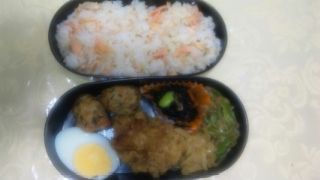 後は冷凍の肉団子とヒジキ、切り干し大根、ピーマンの梅肉和え、から揚げ、茹卵。