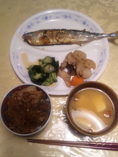 あとは牛丼、煮物、なめこと豆腐の味噌汁、キュウリとワカメの酢の物。