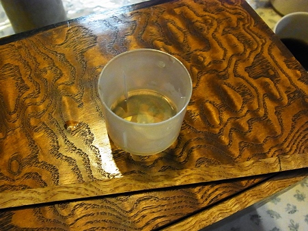 早速、煙草盆の修理に取り掛かりました。背面下部の底板の小口を隠すケヤキの薄い板が剥がれていた物を、多分製作当時にも使ったであろうと思われる「ニカワ」で接着します。ニカワは棒状のニカワを細かくカットし水でふやかした後に湯煎で加熱して溶かすという、手間のかかる接着剤ですが、ここはオリジナル状態を保つためにあえて使いました。だって酢酸ビニル系の木工ボンドじゃねぇ・・・クランプで固定して接着中です。それにしても美しいケヤキです。いまどき、このような材はいくらするものだか・・・。接着がすみ修理完了です。透かし彫りがあり小引き出しが2個あります。ネットで調べても見かけない作りです。表面は透きうるし処理のようです。左の木箱状のものは、銅製の火箱の灰が飛ばないためのカバーのようです。これは桐製でした。そして竹筒は灰吹きというもので、吸い終って火の消えた灰を捨てるところです。手前の蓋付の部分は、多分刻み煙草が入っていたものと思われます。ただ、わからないのが火箱の後ろ側にスリット状のポケットのような部分があり、そこは何に使ったものか不明です。驚いたのは小引き出しの縁取りです。小口が見えないように、盆本体にも施してある黒い薄い板ですが、どうやら黒柿の薄い板を接着してあるようです。汚れを落としていたら木目が現れ、木製であることに気がつきました。ケヤキ、黒柿、内部のヒノキ、桐・・・4種の木材から出来上がっています。民具とはいえ、すばらしいものですね。使うわけにもいかず、リビングでディスプレーしてあります。にほんブログ村ブログランキング参加中です。上のボタンをポチッとクリックお願いします!