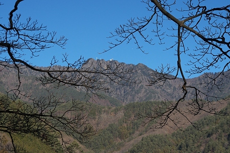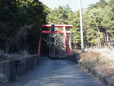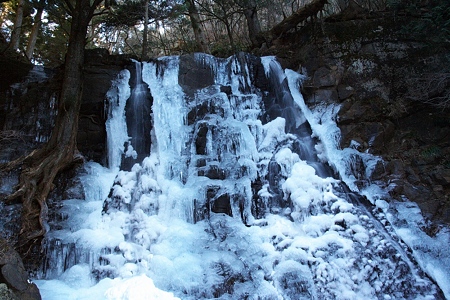 天気は良くとも非常に寒く、さて、何をしようか・・・というところで、リンク先の星宿さんの記事でシモバシラの事が出ていたのを思い出し、見に行くことにしました。といっても、本当の目的地は別なのですが、行きがけの駄賃ということで・・・通称「天神山」(スキー場ではありませんよ)から見る三ッ峠は、小屋から見るのとは違ってこれはこれで、また良いですねぇ。古い祠にも正月飾りです。そういえば来週には小正月の行事「どんど焼き」があるはずですが、まだ何も用意されていませんでした。山の斜面に張り付くように伸びる遊歩道を進んでいきます。凍土状態なのでサクサクも言いません。多分このあたりかなぁ・・・と目星をつけていた場所には何もありません。というより、シモバシラが霜柱をつけていなかったら、ただの枯れ草ですからねぇ。結局わからず移動します。向かった先は、富士河口湖町の「母の白滝」です。これだけ寒けりゃ凍っているはずということで。途中の林道はご覧のような箇所がいくつかあり、夏タイヤには恐怖でしたが、何とか問題なくたどり着きました。誰も居ません。遠くからも白く凍った滝が見えます。空気も凍てついています。さらに滝に近づきます。続くにほんブログ村ブログランキング参加中です。上のボタンをポチッとクリックお願いします!