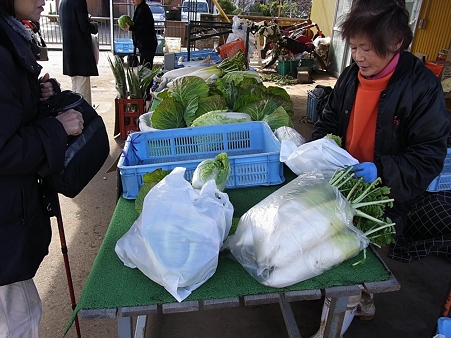 昨日は首都圏でも積雪があって交通機関が乱れたりで大変だったようですね。横浜南部では道路の積雪も無く、庭のタイムの上に多少雪が残っている程度でした。これなら問題なく三浦へ野菜ツアーが出来そうだな・・・ということで、またまた行ってきました。いつもの立石公園です。快晴とはならず、富士山はおろか丹沢も見えません。風もいつもよりは冷たく車の温度計では6度を指します。それでも、海は春っぽく見えるのが三浦西海岸の不思議です。ほとんど残雪も無く東京の積雪の話が、遠いことのように思えます。いつものように荒崎経由で直売所巡りに勤しみます。荒崎方面の小さな直売所は休みのところが一軒、売り切れが一軒。長井水産も休みでした。結局ぐるッと回って収穫無し!それなら本命の初声へ!いつもより車が多く、野菜を買い求める人も多い初声の直売所。このところの野菜の高値で人気が上がったようです。ただ、前回同様野菜も多くはありません。値段もやや高めかな。初めて利用する人もいて買い方がわからないようです。幅1m弱ほどのスペースごとに出品者が違うので、それぞれの料金箱にお金を入れるのが決まりなんです。お釣りも出ませんのでここに来るときには小銭を用意する必要があります。今回はブロッコリーの脇芽も無く、リーフレタスもありませんでした。ここで買ったのは¥100の早春キャベツ、¥150ほうれん草、¥100三浦大根、¥150カリフラワーの計¥500。直売所で上手く買い物をする鉄則があります。出すのは¥150まで!一箇所で全部買い揃えようと思うな!です。さて、次の直売所は・・・にほんブログ村ブログランキング参加中です。上のボタンをポチッとクリックお願いします!