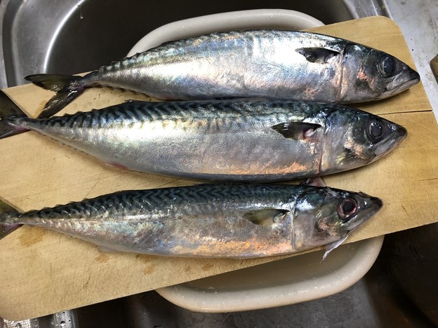 長井水産で買ってきた、紛れもないマサバです。ゴマサバの場合側線より下に濃い灰色の丸い小さな斑点が点在しています。旬も脂ののりも違うんですよね。流石に鮮度はいいですから、一瞬刺し身も考えたのですが、いかんせん処理してあるわけではないのでアニサキスが怖いのでやめました。30cm以上あるので1匹はその日の夕食に塩焼きに、残りは干物に加工します。頭と内蔵を落とし2枚におろします。裏表に塩を振り一晩冷蔵庫に寝かせます。途中で裏返し皮が上に向くようにすると滲み出た水っ気が下に落ちてくれます。翌日朝から天日干しです。まずは腹側から4時間ほど干しました。ひっくり返し、皮側を1時間干したら完成です。あとはラップにくるみ冷凍庫で保存です。サバというと「文化干し」といいますが、文化干しはセロハンで包んだもので、これはただの干物です。焼くとこんな感じです。味が濃縮され非常に美味です。鮮度が良いので魚臭さもありません。こちらは当日にやった塩焼きです。薄っすらと脂がのり美味しかったですよ。刺し身じゃなくて「炙り」にすればアニサキスも退治できるし良かったかも・・・・・にほんブログ村ブログランキング参加中です。上のボタンをポチッとクリックお願いします!