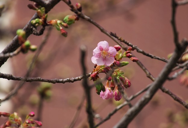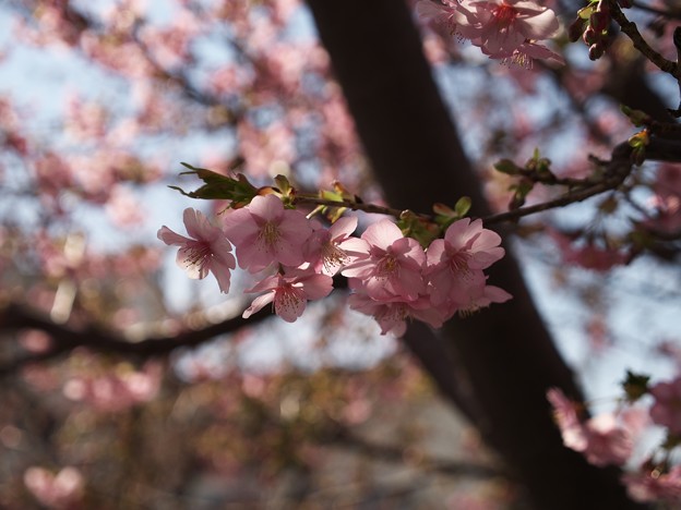 他の場所での河津桜の開花を確認したので、気になる場所を回ってみました。車で通った時に、数輪咲いていたのは確認済みだったので・・・上永谷駅近く、平戸永谷川沿いに河津桜が点々と植樹されています。個体差が大きいのですが多く花開いているもので四分咲くらいでしょうか。この時期はまだ寒かったりするので、ソメイヨシノよりも桃色の強い暖色系の花はいいですね。河津桜は、名前の通り伊豆の河津町で発見された種で、大島桜と緋寒桜の自然交配種です。ソメイヨシノがそうであるように実生で増やせません。すべてが挿し木によるもので、いわばクローンです。同じクローンでも、ソメイヨシノは花期が短いので、一斉に咲いて一斉に散る・・・ですが、河津桜は花期が長いのでばらつきがあります。環状2号線のすぐ近くなのですが、車道からは見えにくい場所なので知っているのは地元の人間くらいでしょうか。ベンチなどもあってのんびり楽しめます。にほんブログ村ブログランキング参加中です。上のボタンをポチッとクリックお願いします!