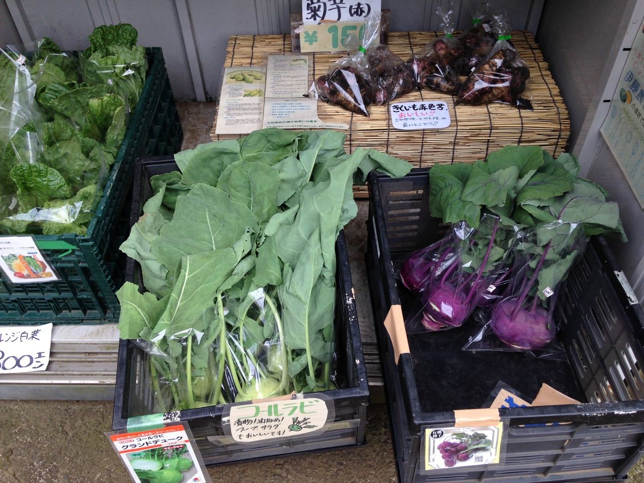 紫色のコールラビもありました。菊芋もあります。白菜も何種類かあって、オレンジ白菜なんてのもありますよ。