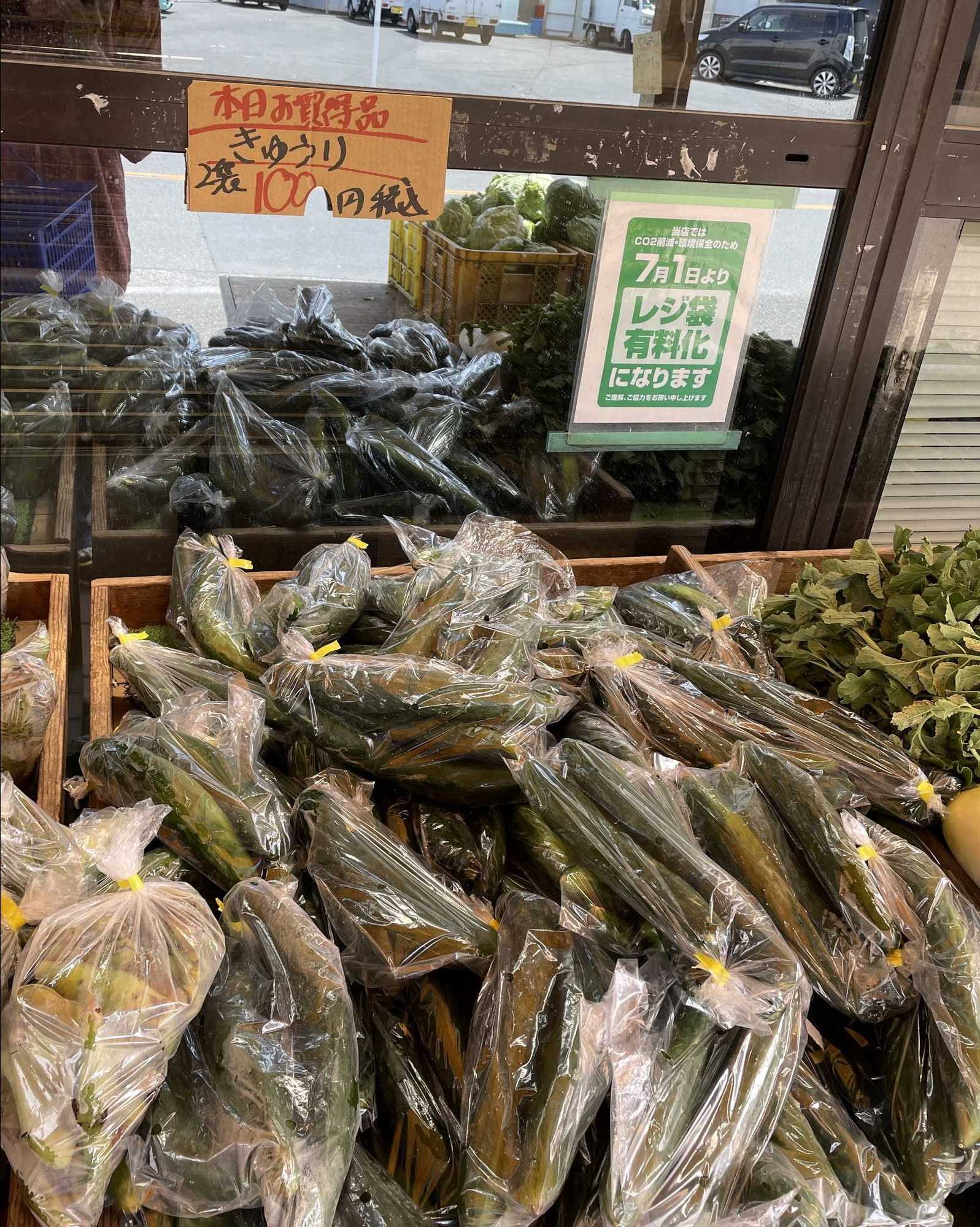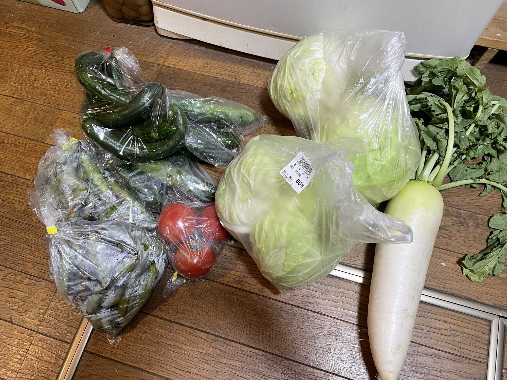 さて、この日の戦果です。同じものが複数あります。キャベツなんて全部で4個です。キュウリは3袋だし・・・・