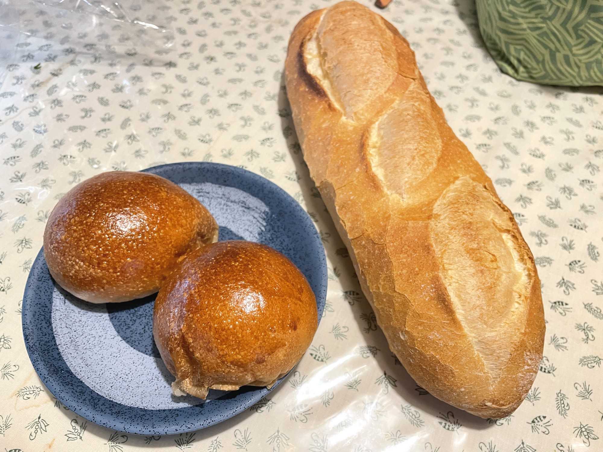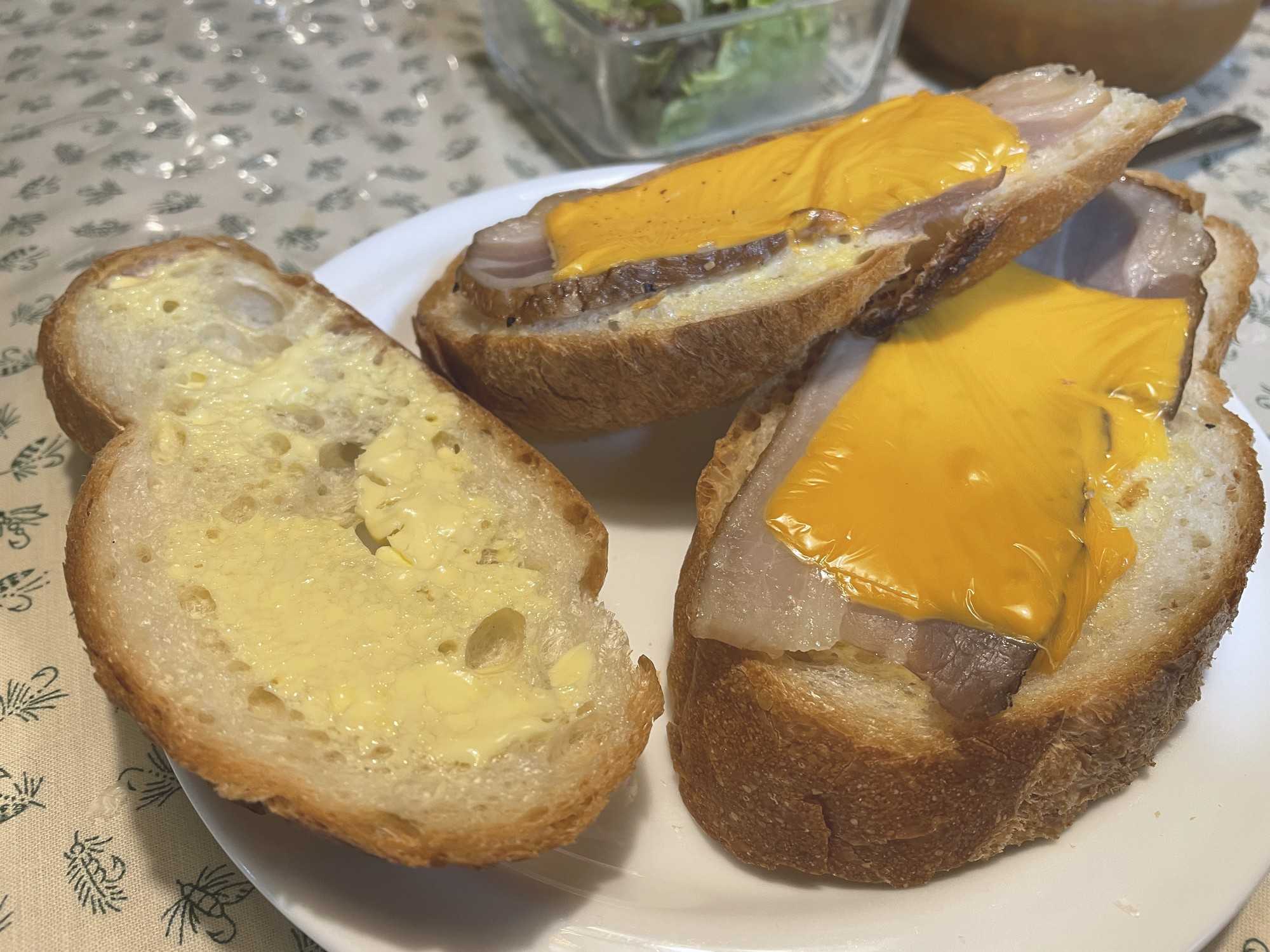 皮がパリッとしていて中はソフトです。王道のバタールです。自家製ベーコンとチーズをのせて焼きました。もっと近かったら毎週買いに行きたいくらいです。
