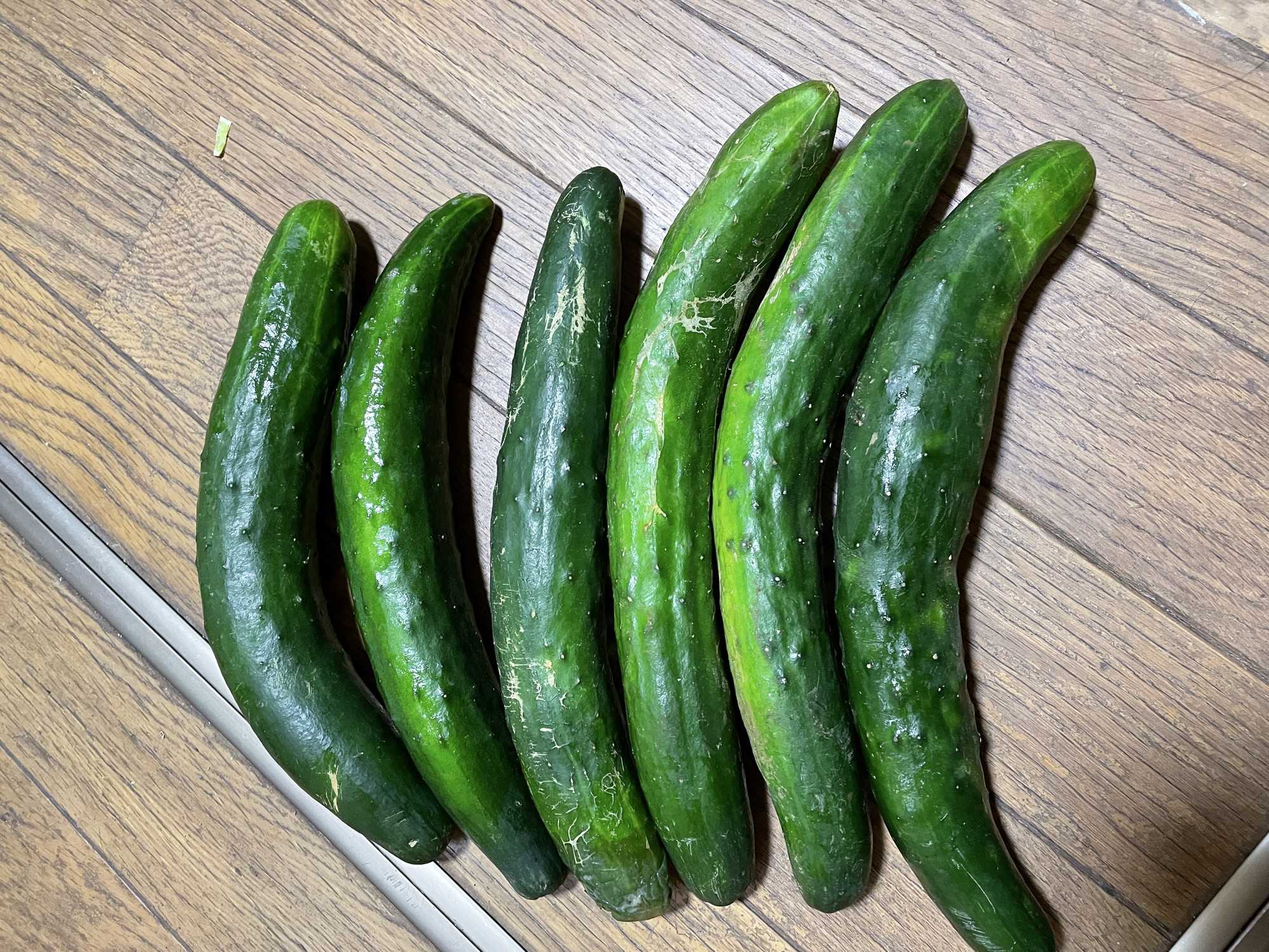 ¥袋¥100のキュウリです。25cmくらいあります。中には種ができていて苦味はほぼ無し。