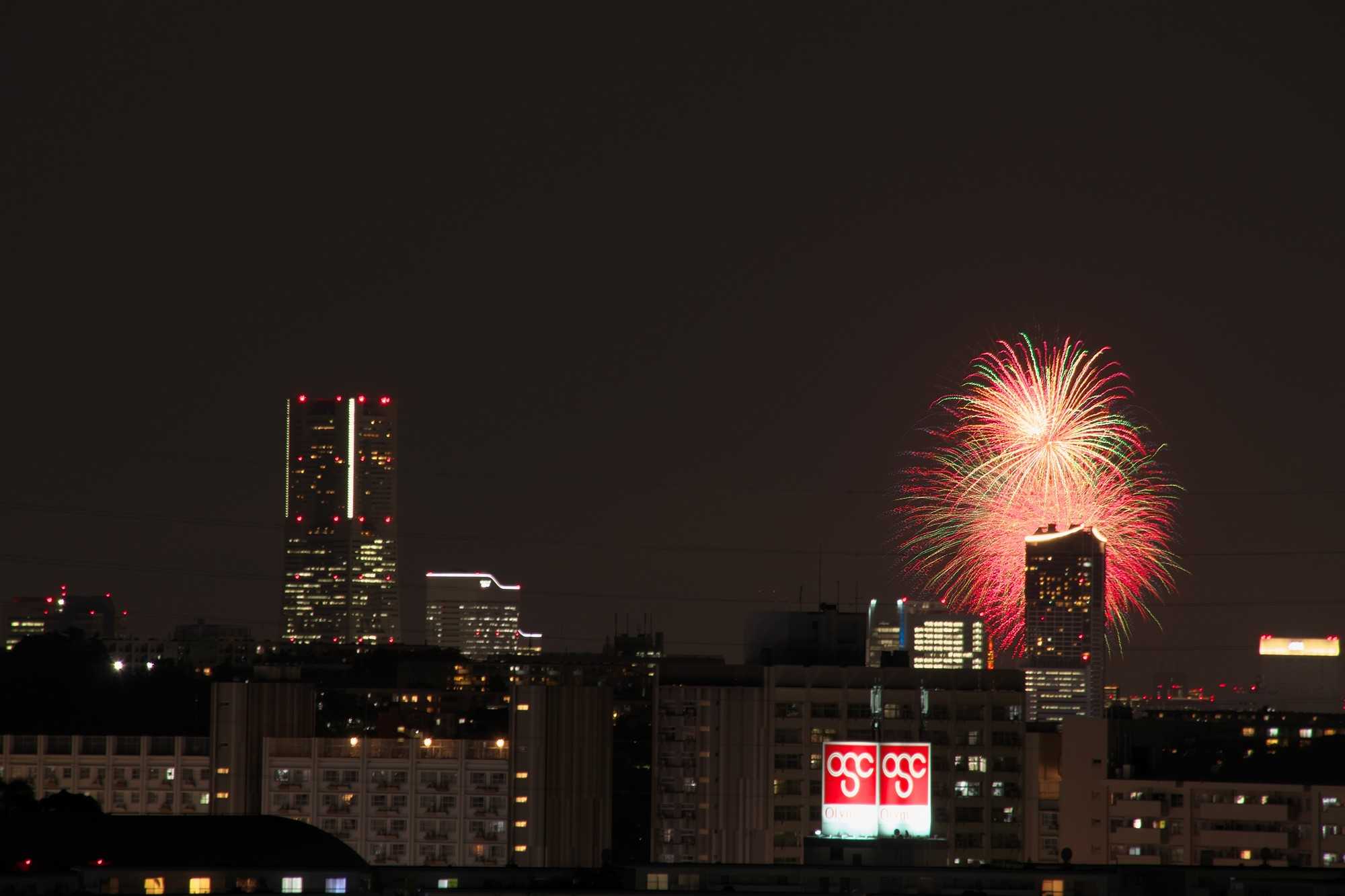 今年は18区それぞれでも短時間ですが打ち上げられるということで、地元の区では、多分あそこかなぁ?と目星をつけ(打ち上げ場所はシークレットなので)それとみなとみらいのメインの花火が撮れるところということで・・・・