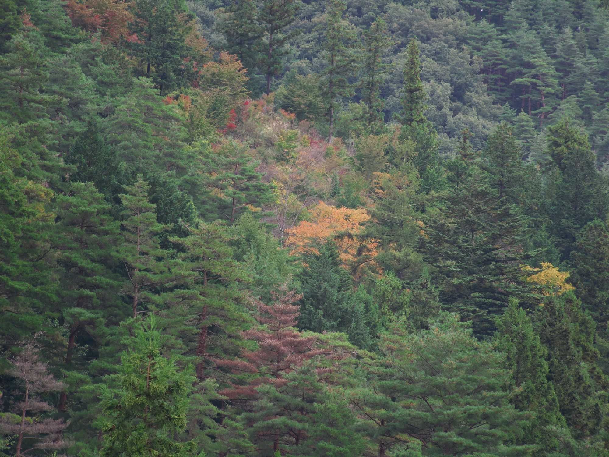 アカマツの林の中に黄葉が点々と。
