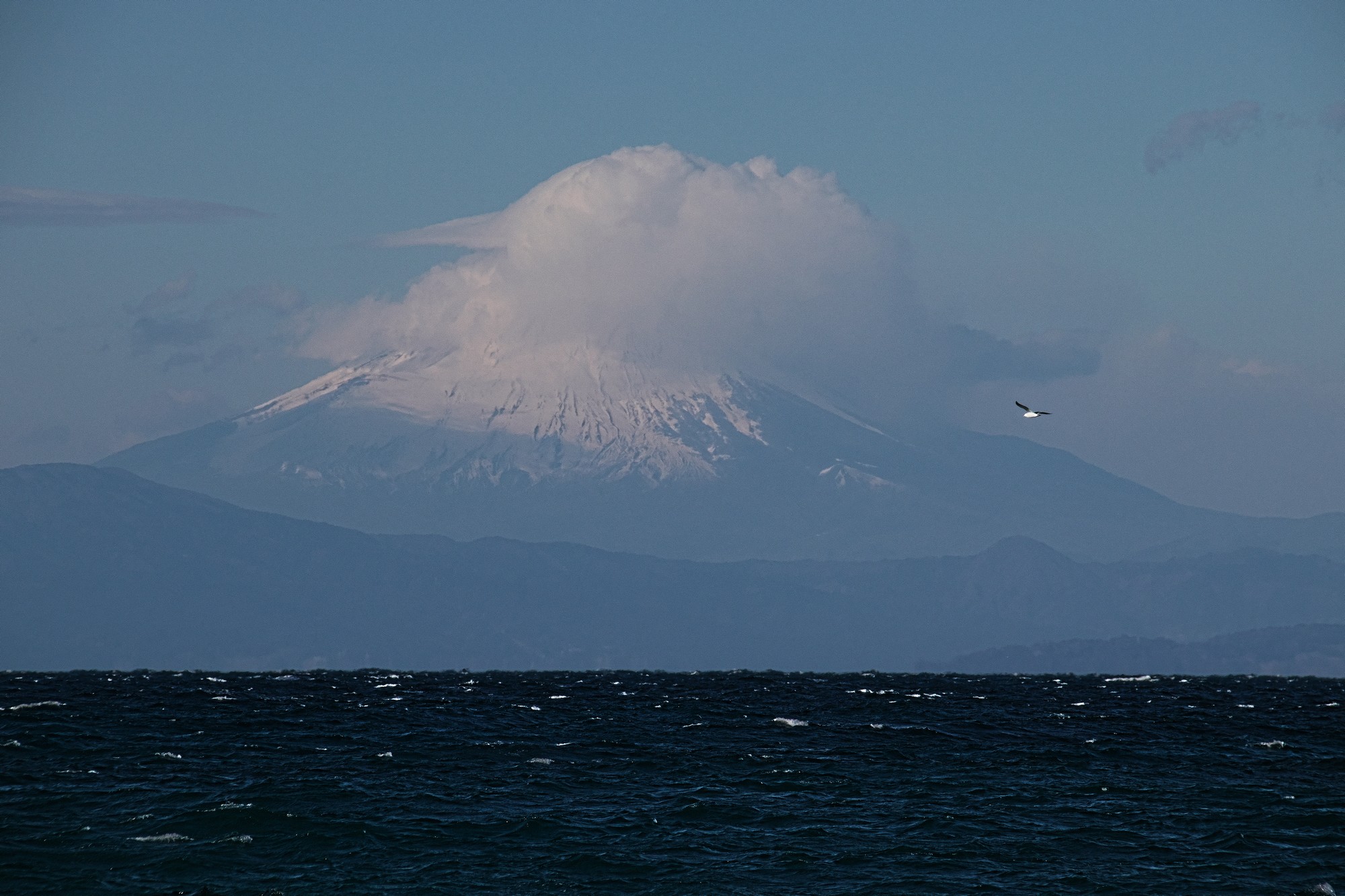 一時期より雪が増えた富士山ですが、頂上あたりは雲の中です。多分西寄りの風が吹き、雲が沸いている雰囲気ですね。この日は空気の透明度も低く南アルプスは見えませんでした。